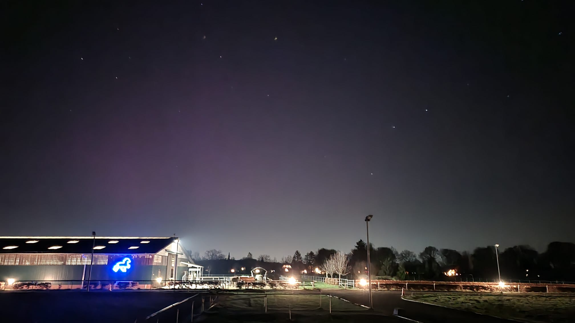 Isländisches Schauspiel am 20. Januar, die Nordlichter tanzen über der Reithalle von Hesta-Kykki.